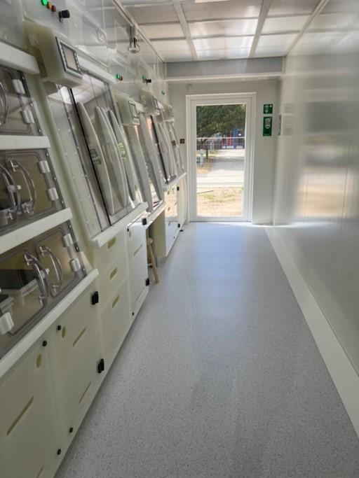 The clean lab is accessible via a double gate consisting of an entrance room and an ante room equipped with an overstep to separate the clean lab from the digestion lab and the entrance area. While experiments are conducted, researchers can work remotely in an attached office room.