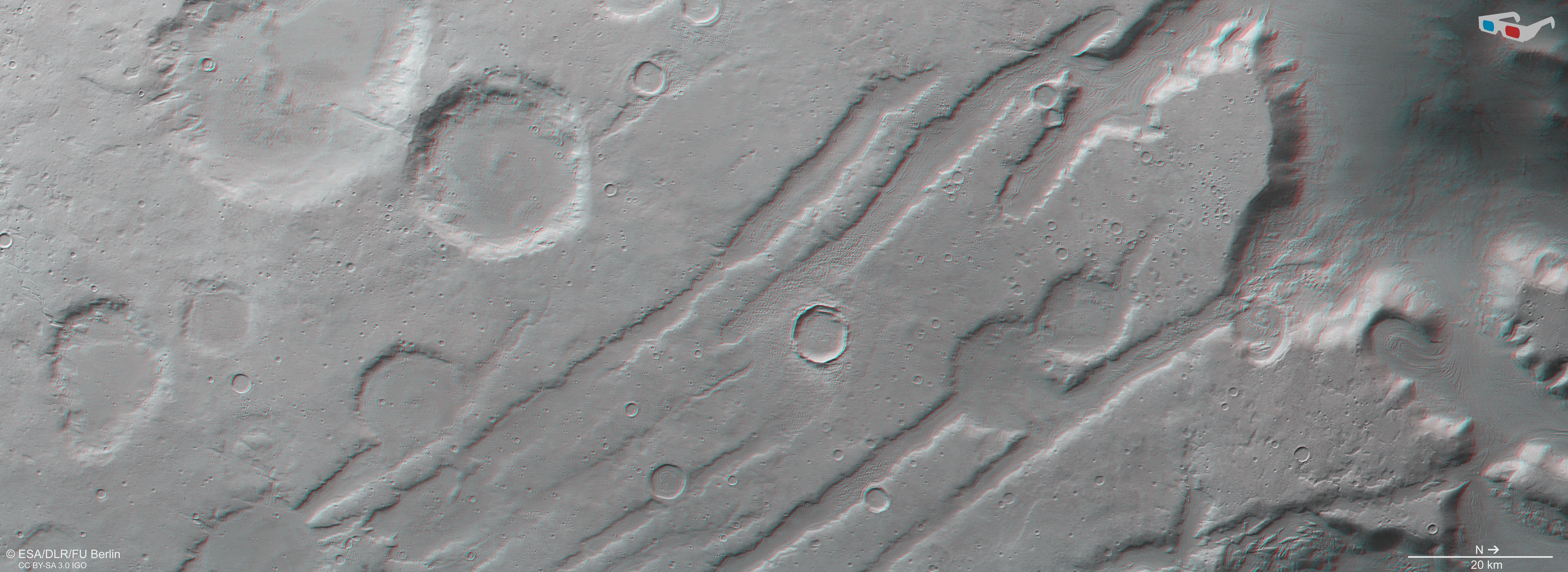 HRSC is a camera experiment that was developed and is operated by the German Aerospace Center (Deutsches Zentrum für Luft- und Raumfahrt; DLR). The systematic processing of the camera data took place at the DLR Institute for Space Research in Berlin-Adlershof. The working group of Planetary Science and Remote Sensing at Freie Universität Berlin used the data to create the image products shown here.