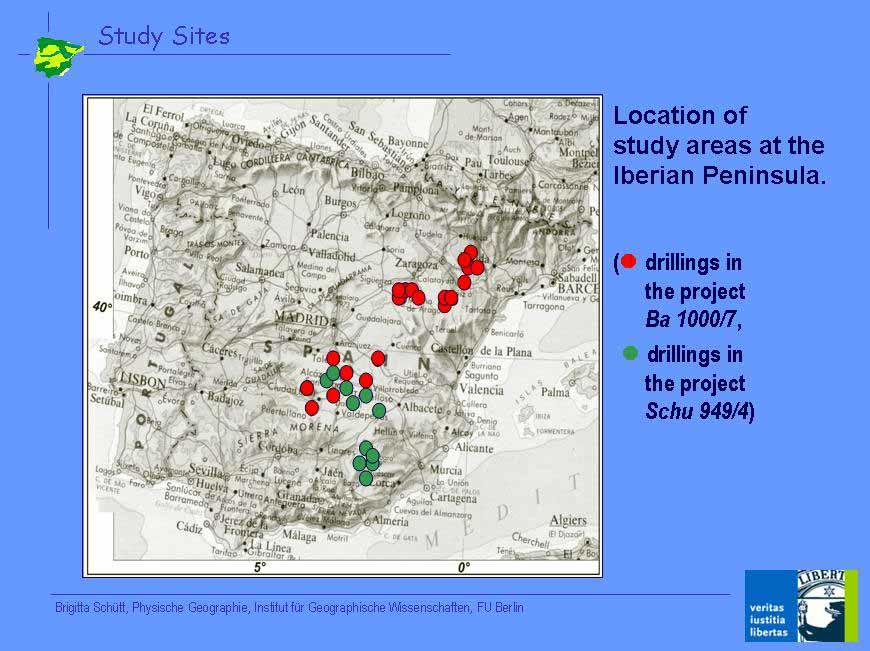 Die Umsetzung dieser Ziele sollte vergleichend für zwei Landschaftsräume in Südost-Spanien durchgeführt werden. Das Einzugsgebiet des Oberen Rio Guadalentin (Communidad Andalucia) , im östlichen Vorland der Sierra Maria, einem südöstlichen Ausläufer der Betischen Kordillere, und die zentrale La Mancha (Prov. Castillia y La Mancha), die im wesentlichen das Einzugsgebiet des Oberen Rio Guadiana abdeckt.