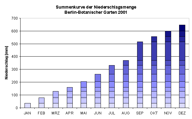 Die ersten beiden Abbildungen zeigen anhand der Summenkurve der Niederschlagsmenge, gemessen an der Station Berlin-Botanischer Garten, den Anteil der einzelnen Monatssummen am Jahresniederschlag in den Jahren 2000 und 2001.
