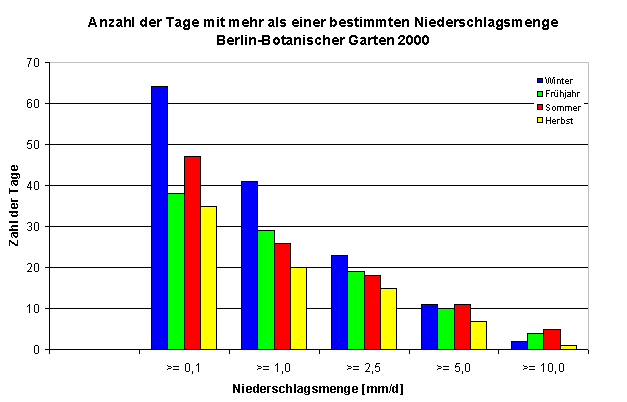 Die folgenden beiden Abbildungen zeigen anhand von Tageswerten des Niederschlages, gemessen an der Station Berlin-Botanischer Garten, aufgeschlüsselt nach den Jahreszeiten wieviel Tage die Niederschlagsmenge mehr als einen bestimmten Wert beträgt.
